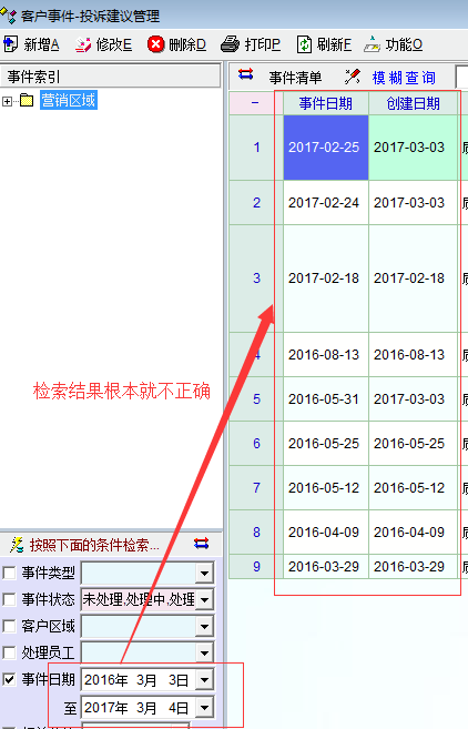怎么不更正、优化一下呢?使用中有时候会造成很大的困惑。就像客户投诉中按照事件日期进行检索,根本没法得到正确的结果,不知道到底是与哪个时间对应:事件日期与创建日期都对应不上。
