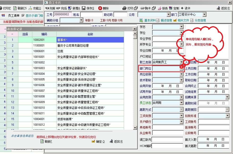 3、在“岗位清单列表”中选择(员工卡片-部门岗位 录入框处 单击后回车弹出;或在“调岗调职-原/新部门岗位”录入窗口双击 弹出)