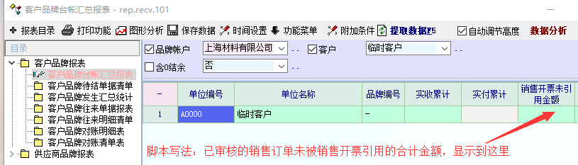 要写的脚本思路是:在【客户品牌台帐汇总报表】中显示一列为,该客户同一品牌帐户 且 已审核销售订单,的销售开票未引用合计金额。