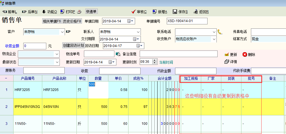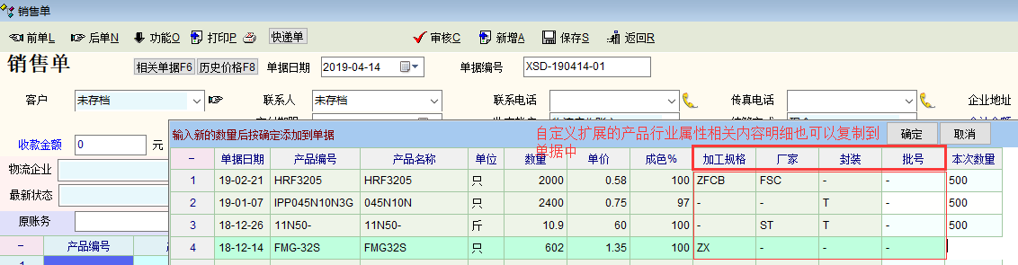 客户历史价格表单中去选择此客户以前买过的产品时没有自动复制产品行业特性明细。建议在输入数量后复制产品明细时包括自定义的产品行业特性明细内容。