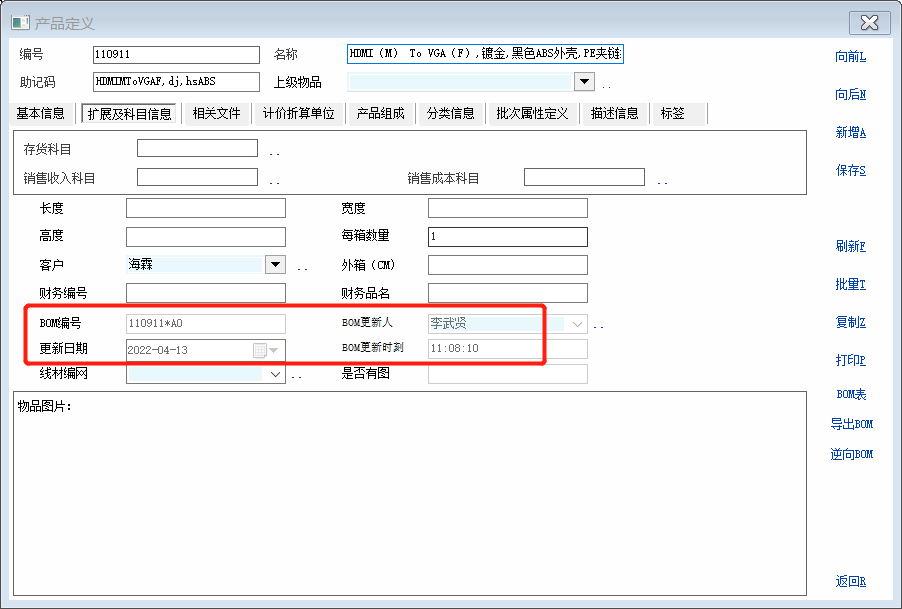 为提高工程人员维护更新BOM的效率,找十二老师定制了实现该功能的dll文件,后又请阿彪老师帮忙完善了实现该功能的脚本。 此脚本是建立在启用BOM的8个扩展属性的基础上(主物资料号保存在第一个扩展属性) 详情参考:BOM扩展属性使用分享 http://myoit.cn/topic_list_detail?subject_id=3&topic_id=102340&topic_page_id=2 在此感谢阿彪老师,十二老师的帮助! 1. 在BOM记录编辑脚本定义添加【同步产品组成】控件 int func_show_win() { if(have_role("0005")==1)//拥有角色权限编号0005(产品资料编辑和BOM编辑权限)的操作员才生成控件 { gui_create_speedbutton("Panel_Func","on9",0,387,80,22,"同步产品组成","call_prog.fzdcp_csp"); } 2. 新建脚本文件 fzdcp_csp int test() { return 1; }; int main() { int i; string sql,vql,m_resid,m_ver,bm_id,sqlattr,v_bombh,v_bomgxr,v_bomgxrq,v_bomgxsk,count_res; m_resid = gui_get_val("edit_Ext1");//获取BOM扩展属性1(主产品料号) bm_id = gui_get_val("Edit_Bom_Id");//获取BOM编号 sql = "select ext_2 from res_composing where res_id = '" + m_resid + "'";//获取产品资料已有产品组成的BOM编号(产品组成明细的自定义2) db_run(sql); m_ver = db_res(0); string tt; tt = "是否同步到:" + m_resid + " 的产品组成明细,版本号为:" + bm_id + " ?"; if (m_ver != "") {tt = "当前产品:" + m_resid + " 存在产品组成明细,版本号为:" + m_ver + " 是否继续同步?";} if (confirm(tt) == 1) { vql = "sub_res_id,num,waste_factor,note_info,order_id,base_num,emf_process_id,sub_attr_val_1,sub_attr_val_2,sub_attr_val_3,ext_1,ext_2,ext_3,ext_4,pcode"; sql = "delete from res_composing where res_id='" + m_resid + "'";//删除BOM对应的产品资料已有的产品组成明细 db_run(sql); sql = " insert into res_composing(res_id," + vql + ")"; sql = sql + " select '" + m_resid + "'," + vql + " from res_bom_item where bom_id='" + bm_id + "'";//更新当前BOM明细到对应的产品资料的产品组成明细 db_run_process(sql); sql = " select count(1) from res_composing where res_id='" + m_resid + "'"; db_run_query(sql); sqlattr = "select * from res_attrwhere res_id='" + m_resid + "' and attr_id in('bombh','bomgxr','bomgxrq','bomgxsk')";//获取产品资料的4个附加扩展属性 db_run_query(sqlattr); count_res = db_row_count();//获取产品资料的附加扩展属性记录数 if (count_res<4) { for (i = 0; i < 4 - count_res;i++) { db_add_row();//添加一行记录 } } for (i = 0; i < 4;i++) { db_go_row(i);//指向对应的记录 db_set_value_ext("res_id",m_resid);//附加扩展属性表名赋值 switch (i) { case 0: db_set_value_ext("attr_id","bombh");//附加属性ID赋值 db_set_value_ext("attr_val", bm_id);//附加属性bombh赋值 break; case 1: db_set_value_ext("attr_id", "bomgxr");//附加属性ID赋值 sql = gui_get_val("ext_Ext5");//获取BOM扩展属性5(BOM更新人) db_set_value_ext("attr_val", sql);//附加属性bomgxr赋值 break; case 2: db_set_value_ext("attr_id", "bomgxrq");//附加属性ID赋值 sql = gui_get_val("date_Ext6");//获取BOM扩展属性5(BOM更新日期) db_set_value_ext("attr_val", sql);//附加属性bomgxrq赋值 break; case 3: db_set_value_ext("attr_id", "bomgxsk");//附加属性ID赋值 sql = gui_get_val("edit_Ext7");//获取BOM扩展属性5(BOM更新时刻) db_set_value_ext("attr_val", sql);//附加属性bomgxsk赋值 break; } } db_select_area(2);//选择工作区2 sql = "delete from res_attr where res_id='" + m_resid + "' and attr_id in('bombh','bomgxr','bomgxrq','bomgxsk') ";//删除对应产品资料已有的4个附加扩展属性值 db_run(sql); db_select_area(1);//选择工作区1 db_set_table_name("res_attr");//设置表的名称 db_batch_insert();//更新产品资料的附加扩展属性值 if (db_row_count() > 0) { dbg('同步到 '+m_resid+' 的产品组成明细成功!') //view_app_obj("res", m_resid);//打开成品资料 } } return 1; }; |