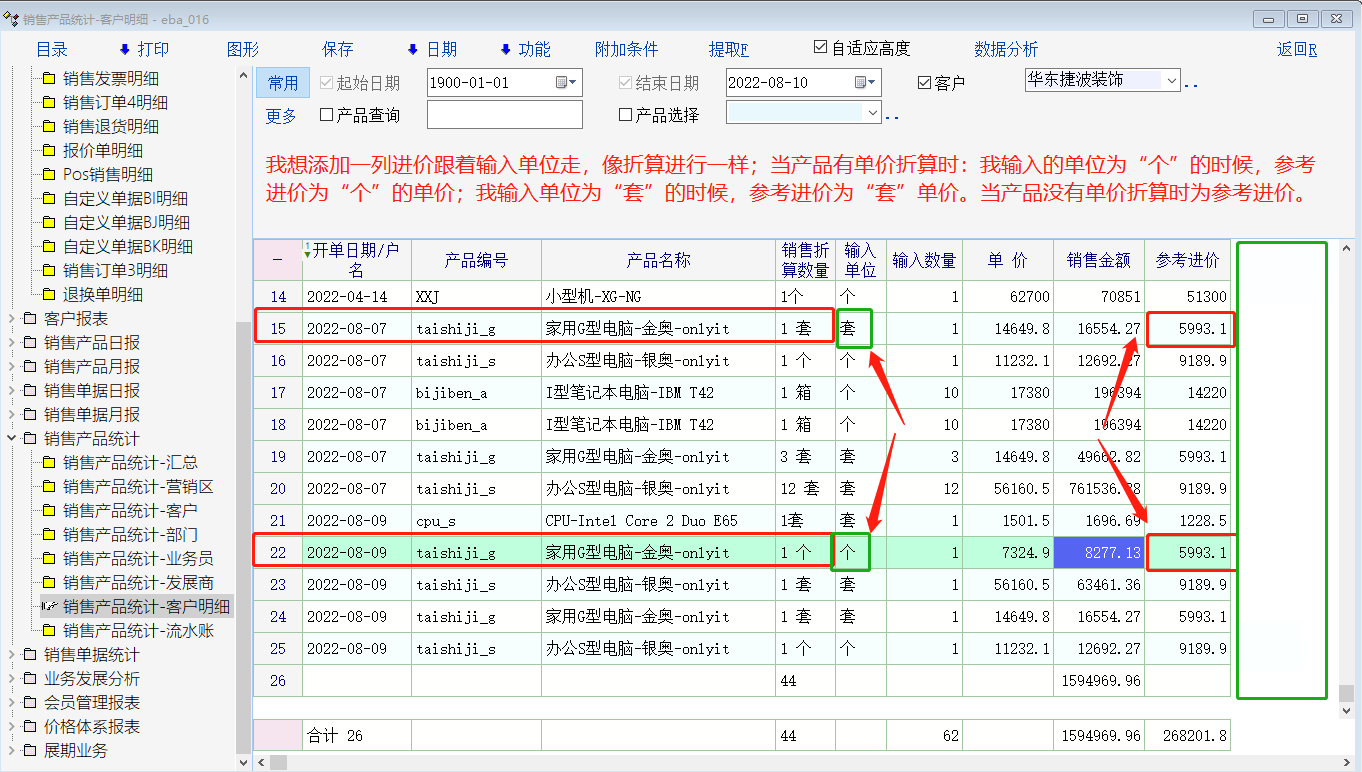 我暂时只用到进销存,要添加地方有两个处,第一个在销售报表:销售报表---销售产品统计---(客户明细、流水帐);销售报表---销售单据明细。 第二个在销售类单据:销售单据:按F8查看历史价格窗口里的“历史记录”窗口、“销售记录”窗口,添加了这个里面的“切换单位”就没有什么用了,可以去掉;这个看进价信息更直观。