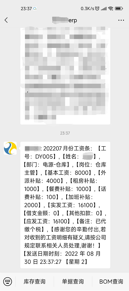 今天在论坛看到有用户需要用企业微信发送工资条,官方回复后续会考虑添加这个功能,我今天临时写了这个脚本分享出来供有需要的人参考 int init_test() { return 1; }; int create_voucher() { return 1; }; int func_show() { if(is_user_in_group("工资单制单"))//添加一个操作员分组,把有权限发送工资信息的操作员添加进来 { gui_create_speedbutton("Panel_Func","QiYeWxTz",950,7,180,22,"发送工资信息到员工企业微信","call_csp.voucher.IA.QiYeWxTz"); }; return 1; }; int adjust_row() { return 1; }; int func_before_print() { //can_print=1; return 1; }; int func_before_save() { //can_save=1; return 1; }; int func_after_check() { return 1; }; int func_after_print() { return 1; }; int func_after_show_wage_data() { return 1; }; int QiYeWxTz() { int i,grid_rows; string v_id,v_qywx,v_name,m_yf,v_gh,v_xm,v_bm,v_gw,v_jbgz,v_wpbt,v_zfbt,v_cfbt; string v_hfbt,v_jbbt,v_sfgz,v_jzje,v_qtkk,v_yfgz,v_bz,v_gzxx,v_bz,m_dqrq,m_dqsk,m_xq; m_yf = str_cut(gui_get_val("DateTimePicker_Data_Month"),6) m_dqrq = fmt_date(get_cur_date(),'yyyy 年 mm 月 dd 日'); m_xq = get_week_id(get_serv_date()); m_dqsk = get_cur_time(); grid_rows = grid_row_num('MG_Item'); for(i=1;i<grid_rows;i++) { v_id = grid_get_v("MG_Item","emp_id",i); v_name = grid_get_v("MG_Item","emp_name",i); v_bm = grid_get_v("MG_Item","dept_name",i); v_gw = grid_get_v("MG_Item","dept_post_name",i); v_jbgz = wage_get_emp_subject_data(v_id,m_yf,'A01'); v_wpbt = wage_get_emp_subject_data(v_id,m_yf,'A02'); v_zfbt = wage_get_emp_subject_data(v_id,m_yf,'A03'); v_cfbt = wage_get_emp_subject_data(v_id,m_yf,'A04'); v_hfbt = wage_get_emp_subject_data(v_id,m_yf,'A05'); v_jbbt = wage_get_emp_subject_data(v_id,m_yf,'A06'); v_yfgz = wage_get_emp_subject_data(v_id,m_yf,'A07'); v_jzje = wage_get_emp_subject_data(v_id,m_yf,'A08'); v_qtkk = wage_get_emp_subject_data(v_id,m_yf,'A09'); v_sfgz = wage_get_emp_subject_data(v_id,m_yf,'A10'); v_bz = grid_get_v("MG_Item","note_info",i); v_qywx = get_emp_info(v_id,'msn_no'); // 要在员工资料的微信栏位录入该员工的企业微信号 v_gzxx = m_yf+'月份工资条:【工号:'+v_id+'】,【姓名:'+v_name+'】,【部门:'+v_bm+'】,【岗位:'+v_gw+'】,【基本工资:' v_gzxx = v_gzxx+v_jbgz+'】,【外派补贴:'+v_wpbt+'】,【租房补贴:'+v_zfbt+'】,【餐费补贴:'+v_cfbt+'】,【话费补贴:'+v_hfbt v_gzxx = v_gzxx+'】,【加班补贴:'+v_jbbt+'】,【应发工资:'+v_yfgz+'】,【借支金额:'+v_jzje+'】,【其他扣款:'+v_qtkk v_gzxx = v_gzxx+'】,【实发工资:'+v_sfgz+'】,【备注:'+v_bz+'】,【感谢您的辛勤付出,若对收到的工资明细有疑义,请按公司规定联系相关人员处理,谢谢!】' v_gzxx = v_gzxx+'【发送日期时刻:'+m_dqrq+' '+m_dqsk+' 星期 '+m_xq+'】' if(v_id ==''){ msg('没有工资明细数据'); return 0; }if(v_id !='' && v_qywx != ''){ send_qywx_msg(v_qywx,v_gzxx); }if(v_id !='' && v_qywx == ''){ dbg('【员工:'+v_id+' '+v_name+'】的人事资料的微信栏位没有录入企业微信号,请联系人事资料维护员补录入后再发送工资信息到员工企业微信!');}; }; return 1; }; int main() { return 1; }; |