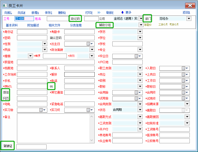 有用户在论坛发帖希望员工卡片的必填项目控件名能设置为红色以便能突出显示出来让人事资料建档人员录入资料时一目了然,在官方没有更新这个功能之前,可以先参考我的这个脚本(我增加了控件名前面加*)以达到使用需求 必填项目有增减的,需要重新登录才能刷新 打开员工卡片编辑辅助脚本定义(rec.emp) extern change_obj; int func_f9_call() { //msg('f9 pressed'); return 1; }; int func_show_win() { int i,count; string sql,Mzd,v; db_run("select col_id from app_not_null_def where tab_id='emp'")//获取员工卡片必填项目定义明细 count = db_row_count();//已定义的控件数 gui_set_font_color('Label27',16711935);//工号 gui_set_font_color('Label28',16711935);//姓名 for (i = 0; i < count;i++) { db_go_row(i); Mzd = db_res(0) if(Mzd == 'dept_id'){ gui_set_font_color('Label_Dept',0x0000ff); gui_set_text("Label_Dept",'*'+gui_get_text("Label_Dept"))//1.部门 }if(Mzd == 'cross_group_id'){ gui_set_font_color('Label1',0x0000ff); gui_set_text("Label1",'*'+gui_get_text("Label1"))//2.辅助分组 }if(Mzd == 'nation'){ gui_set_font_color('Label_Nation',0x0000ff); gui_set_text("Label_Nation",'*'+gui_get_text("Label_Nation"))//3.民族 }if(Mzd == 'polity'){ gui_set_font_color('Label_Polity',0x0000ff); gui_set_text("Label_Polity",'*'+gui_get_text("Label_Polity"))//4.政治面貌 }if(Mzd == 'marriage_flag'){ gui_set_font_color('Label_Marriage_Flag',0x0000ff); gui_set_text("Label_Marriage_Flag",'*'+gui_get_text("Label_Marriage_Flag"))//5.婚姻 }if(Mzd == 'college'){ gui_set_font_color('Label_College',0x0000ff); gui_set_text("Label_College",'*'+gui_get_text("Label_College"))//6.学校 }if(Mzd == 'specialty'){ gui_set_font_color('Label_Specialty',0x0000ff); gui_set_text("Label_Specialty",'*'+gui_get_text("Label_Specialty"))//7.专业 }if(Mzd == 'native_place'){ gui_set_font_color('Label_Native_Place',0x0000ff); gui_set_text("Label_Native_Place",'*'+gui_get_text("Label_Native_Place"))//8.籍贯 }if(Mzd == 'home_address'){ gui_set_font_color('Label_Home_Address',0x0000ff); gui_set_text("Label_Home_Address",'*'+gui_get_text("Label_Home_Address"))//9.家庭地 }if(Mzd == 'culture_degree'){ gui_set_font_color('Label_Culture_Degree',0x0000ff); gui_set_text("Label_Culture_Degree",'*'+gui_get_text("Label_Culture_Degree"))//10.学历 }if(Mzd == 'related_man'){ gui_set_font_color('Label_Related_Man',0x0000ff); gui_set_text("Label_Related_Man",'*'+gui_get_text("Label_Related_Man"))//11.联系人 }if(Mzd == 'graduate_date'){ gui_set_font_color('Label_Graduate_Date',0x0000ff); gui_set_text("Label_Graduate_Date",'*'+gui_get_text("Label_Graduate_Date"))//12.毕业日 }if(Mzd == 'sex'){ gui_set_font_color('Label_Sex',0x0000ff); gui_set_text("Label_Sex",'*'+gui_get_text("Label_Sex"))//13.性别 }if(Mzd == 'birthday'){ gui_set_font_color('Label_Birthday',0x0000ff); gui_set_text("Label_Birthday",'*'+gui_get_text("Label_Birthday"))//14.出生日 }if(Mzd == 'register_location'){ gui_set_font_color('Label_Register_Location',0x0000ff); gui_set_text("Label_Register_Location",'*'+gui_get_text("Label_Register_Location"))//15.户口地 }if(Mzd == 'file_location'){ gui_set_font_color('Label_File_Location',0x0000ff); gui_set_text("Label_File_Location",'*'+gui_get_text("Label_File_Location"))//16.档案地 }if(Mzd == 'work_location'){ gui_set_font_color('Label_Work_Location',0x0000ff); gui_set_text("Label_Work_Location",'*'+gui_get_text("Label_Work_Location"))//17.工作场所 }if(Mzd == 'avocation'){ gui_set_font_color('Label_Avocation',0x0000ff); gui_set_text("Label_Avocation",'*'+gui_get_text("Label_Avocation"))//18.爱好 }if(Mzd == 'residence_type'){ gui_set_font_color('Label_Residence_Type',0x0000ff); gui_set_text("Label_Residence_Type",'*'+gui_get_text("Label_Residence_Type"))//19.类别 }if(Mzd == 'note_info'){ gui_set_font_color('Label_Note_Info',0x0000ff); gui_set_text("Label_Note_Info",'*'+gui_get_text("Label_Note_Info"))//20.备注 }if(Mzd == 'telephone'){ gui_set_font_color('Label_Telephone',0x0000ff); gui_set_text("Label_Telephone",'*'+gui_get_text("Label_Telephone"))//21.电话 }if(Mzd == 'mobile'){ gui_set_font_color('Label_Mobile',0x0000ff); gui_set_text("Label_Mobile",'*'+gui_get_text("Label_Mobile"))//22.手机 }if(Mzd == 'email'){ gui_set_font_color('Label_Email',0x0000ff); gui_set_text("Label_Email",'*'+gui_get_text("Label_Email"))//23.EMAIL }if(Mzd == 'qq_no'){ gui_set_font_color('Label_Qq',0x0000ff); gui_set_text("Label_Qq",'*'+gui_get_text("Label_Qq"))//24.QQ }if(Mzd == 'msn_no'){ gui_set_font_color('Label_Msn',0x0000ff); gui_set_text("Label_Msn",'*'+gui_get_text("Label_Msn"))//25.微信 }if(Mzd == 'other_im_no'){ gui_set_font_color('Label_Other_Im_No',0x0000ff); gui_set_text("Label_Other_Im_No",'*'+gui_get_text("Label_Other_Im_No"))//26.其它通信 }if(Mzd == 'person_web'){ gui_set_font_color('Label_PersonWeb',0x0000ff); gui_set_text("Label_PersonWeb",'*'+gui_get_text("Label_PersonWeb"))//27.网页 }if(Mzd == 'home_phone'){ gui_set_font_color('Label_Home_Phone',0x0000ff); gui_set_text("Label_Home_Phone",'*'+gui_get_text("Label_Home_Phone"))//28.宅电 }if(Mzd == 'urgent_telephone'){ gui_set_font_color('Label_Urgent_Telephone',0x0000ff); gui_set_text("Label_Urgent_Telephone",'*'+gui_get_text("Label_Urgent_Telephone"))//29.紧急电话 }if(Mzd == 'paper_id'){ gui_set_font_color('Label_Paper_Id',0x0000ff); gui_set_text("Label_Paper_Id",'*'+gui_get_text("Label_Paper_Id"))//30.身份证 }if(Mzd == 'emp_card_no'){ gui_set_font_color('Label_Emp_Card_No',0x0000ff); gui_set_text("Label_Emp_Card_No",'*'+gui_get_text("Label_Emp_Card_No"))//31.考勤卡 }if(Mzd == 'dept_post'){ gui_set_font_color('Label_Dept_Post',0x0000ff); gui_set_text("Label_Dept_Post",'*'+gui_get_text("Label_Dept_Post"))//32.岗位 }if(Mzd == 'post_date'){ gui_set_font_color('Label_Post_Date',0x0000ff); gui_set_text("Label_Post_Date",'*'+gui_get_text("Label_Post_Date"))//33.上岗日 }if(Mzd == 'contract_type'){ gui_set_font_color('Label_Contrac