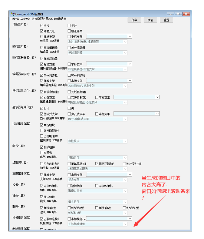 但是配置的勾选项过多, 高度不够用了. 窗口不会出现滚动条来.