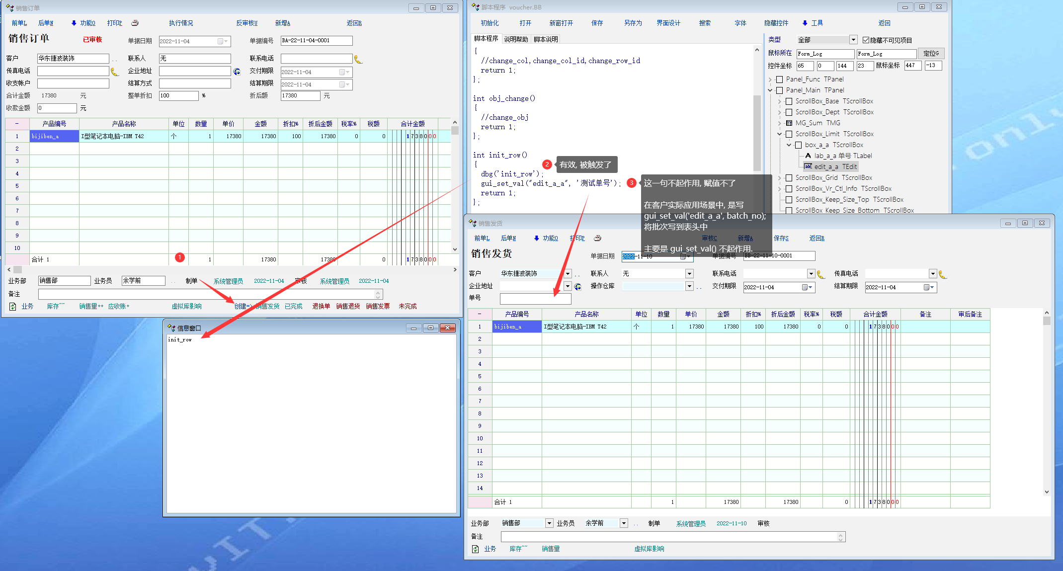 比较细节的地方. 1. 在销售发货单增加了 单据附加属性 a_a 单号 2. 在销售发货单的 init_row 脚本中写入 int init_row() { dbg('init_row'); gui_set_val("edit_a_a", '测试单号'); return 1; }; 3. 正常: 如果单独直接在销售发货单中插入一行, 会将 测试单号 写入单据的附加属性控件中. 4. 不正常的情况: 在销售订单中创建销售发货单, 会触发 销售发货的 init_row, 但是gui_set_val 函数不能赋值给控件 不生效 |
