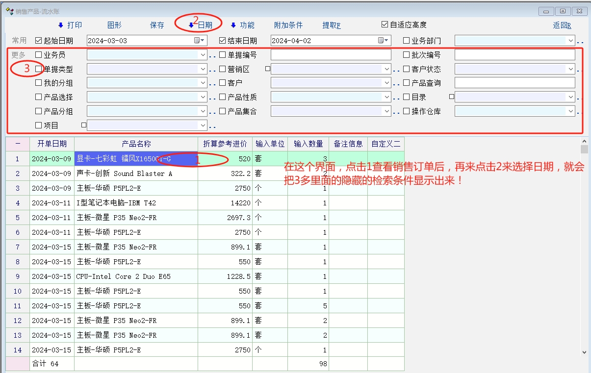 经过不断尝试,这个不是脚本的问题,是系统的问题。在报表里提取数据后,点进去查看销售订单的时候,再去报表里选日期就会把更多里的检索条件显示出来。(既检索条件全部显示出来了)