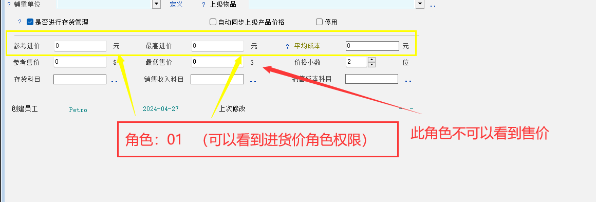 求助_各位老师,求助 产品定义(产品资料内)的售价和进价 如何设置对应角色的显示方案_使用经验