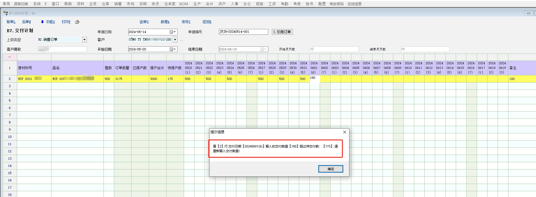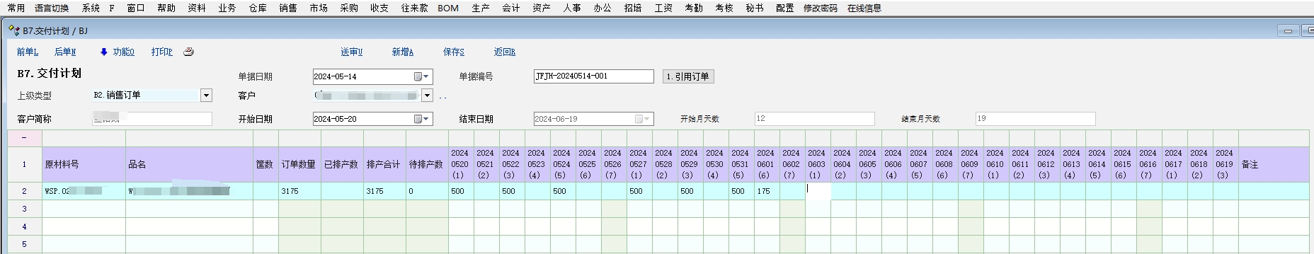 有客户需要把手工做的交货计划转移到系统里面录入,录入销售订单完成后,就开始根据实际生产计划做一个月的分批交货计划回传给客户,要求锁定星期天不可安排交货 提供给客户的解决方案思路: 1. 启用销售单据的自定义单据BJ改名:B7.交货记录(销售模块第7个启用的单据) 2. 增加5个表头附加扩展属性定义【khjc:客户简称】,【pcksrq:开始日期】,【pcjsrq:结束日期】,【yfts1:开始月天数】,【yfts2:结束月天数】 3. 增加31个单据明细附加扩展属性定义的交付日期列【jfrq01~jfrq31】 4. 新增一个不进行库存管理的产品资料【料号:原材料号,品名:品名】用来替代单据标题行 5. 显示方案把料号,品名,明细自定义列1-5,31个明细附加扩展列和备注列的标题名改为空 ,脚本定义录入开始日期回车后,自动添加这个产品到第一行 6. 默认开始日期为今年第一天20240101,脚本限定没有修改这个开始日期之前不能引用上级单据 BJ单据脚本 int init_test() { return 1; }; int create_voucher() { grid_mark_readonly('MG_Item','vr_item_ext_2') grid_mark_readonly('MG_Item','vr_item_ext_3') grid_mark_readonly('MG_Item','vr_item_ext_4') grid_mark_readonly('MG_Item','vr_item_ext_5') gui_set_val("date_pcksrq",'20240101'); //设置初始交付日期,以便限定此日期不能引用订单 return 1; }; int 锁定星期天的交付日期() { int i; string v_pcrq; for(i=1;i<=31;i++); //循环获取排产日期列 { v_pcrq = str_get_sub(grid_get_v("MG_Item",'jfrq'+fmt_int(i,"%02d"),1),0,8); //获取所有交付日期 grid_unmark_readonly('MG_Item','jfrq'+fmt_int(i,"%02d"),1) //解锁所有交付日期 if(get_week_id(v_pcrq) == '7') //当交付日期为星期天时,锁定该日期列 { grid_mark_readonly('MG_Item','jfrq'+fmt_int(i,"%02d"),1) } }; return 1; }; int func_show() { 锁定星期天的交付日期() gui_disable("edit_khjc"); gui_disable("date_pcjsrq"); gui_disable("edit_yfts1"); gui_disable("edit_yfts2"); gui_create_button("ScrollBox_Base","Switch_on13",925,7,75,22,"1.引用订单","call_csp.voucher.BJ.switchon13"); return 1; }; int cell_change() { int i,j; string v_jfrq; j = change_row_id; num ext1,ext2,ext3,ext5,v_pcsl,v_pcrq,inpnum,rq01,rq02,rq03,rq04,rq05,rq06,rq07,rq08,rq09,rq10,rq11,rq12,rq13,rq14,rq15; num rq16,rq17,rq18,rq19,rq20,rq21,rq22,rq23,rq24,rq25,rq26,rq27,rq28,rq29,rq30,rq31 for(i=1;i<=31;i++); { v_jfrq = 'jfrq'+fmt_int(i,"%02d") if(change_col == v_jfrq) { ext1 = vr_item_ext_1 ext2 = vr_item_ext_2 ext3 = vr_item_ext_3 ext5 = vr_item_ext_5 inpnum = inp_num rq01 = jfrq01; rq02 = jfrq02; rq03 = jfrq03; rq04 = jfrq04; rq05 = jfrq05; rq06 = jfrq06; rq07 = jfrq07; rq08 = jfrq08; rq09 = jfrq09; rq10 = jfrq10; rq11 = jfrq11; rq12 = jfrq12; rq13 = jfrq13; rq14 = jfrq14; rq15 = jfrq15; rq16 = jfrq16; rq17 = jfrq17; rq18 = jfrq18; rq19 = jfrq19; rq20 = jfrq20; rq21 = jfrq21; rq22 = jfrq22; rq23 = jfrq23; rq24 = jfrq24; rq25 = jfrq25; rq26 = jfrq26; rq27 = jfrq27; rq28 = jfrq28; rq29 = jfrq29; rq30 = jfrq30; rq31 = jfrq31; inp_num = rq01+rq02+rq03+rq04+rq05+rq06+rq07+rq08+rq09+rq10+rq11+rq12+rq13+rq14+rq15+rq16+rq17+rq18+rq19+rq20+rq21+rq22+rq23+rq24+rq25+rq26+rq27+rq28+rq29+rq30+rq31 vr_item_ext_4 = rq01+rq02+rq03+rq04+rq05+rq06+rq07+rq08+rq09+rq10+rq11+rq12+rq13+rq14+rq15+rq16+rq17+rq18+rq19+rq20+rq21+rq22+rq23+rq24+rq25+rq26+rq27+rq28+rq29+rq30+rq31 vr_item_ext_5 = ext2 - ext3 - inp_num if(ext2 - ext3 - inp_num < '0') { v_pcrq = grid_get_v('MG_Item',v_jfrq,1) v_pcsl = grid_get_v('MG_Item',v_jfrq,j) msg('第【'+j+'】行,交付日期【'+v_pcrq+'】输入的交付数量【'+v_pcsl+'】超过待交付数:【'+ext5+'】,请重新输入交付数量!') return 0; } } }; //change_col,change_col_id,change_row_id return 1; }; int 生成交付日期() //按照开始日期生成最近1个月的所有日期到明细第一行 { string m_ksrq,m_jsrq,m_ny1,m_ny2,m_ny,m_yf1,m_yf2,m_rq1,m_rq2,m_yfts1,m_yfts2,m_jsrq,m_jhts1,m_jhts2,m_jsrq1,m_jsrq2,v_jfrq,v_jfrq1,v_jfrq2,v_jfrq3; num m_ny1,m_yf1,m_rq1,m_yfts1,m_yfts2,m_ksrq,m_ksrq1,m_jhts1,m_jhts2,m_yfts1,m_yfts2; m_ksrq = gui_get_val("date_pcksrq") //获取开始日期 m_ny1 = str_get_sub(m_ksrq,0,6); //获取开始年月 m_ny2 = month_add(m_ny1,'1'); //获取结束年月(开始年月的下月) m_yf1 = str_get_sub(m_ksrq,4,2); //获取开始月份 m_yf2 = str_get_sub(m_ny2,4,2); //获取结束月份 m_rq1 = str_get_sub(m_ksrq,6,2); //获取开始日期 m_jsrq = fmt_int(m_rq1-1,"%02d") //获取结束日期 m_yfts1 = get_month_days(m_yf1) //获取开始月份天数 m_jhts1 = m_yfts1 - m_rq1 + 1 //获取开始月份实际天数 gui_set_val("edit_yfts1",m_jhts1); //赋值开始月天数 if(m_rq1 == '01') //当开始月日期为1号的时候,结束日期为当月最后一天 { m_jsrq1 = str_get_sub(m_ksrq,0,6)+get_month_days(m_yf1) //获取结束日期(开始年月+当月天数 gui_set_val("date_pcjsrq",m_jsrq1); //赋值结束日期 gui_set_val("edit_yfts2",'0'); //赋值结束月天数 }if(m_rq1 != '01'){ //当开始日期不是1号的时候,结束日期为开始月的次月(开始月日期-1天) m_jsrq2 = str_get_sub(m_ny2,0,6)+m_jsrq //获取结束日期(结束年月+结束日期) gui_set_val("date_pcjsrq",m_jsrq2); //赋值结束日期 m_yfts2 = get_day_between(m_ny2+'01',m_jsrq2)+1 //获取结束月份天数(结束月份1号到结束日期的天数差+1) gui_set_val("edit_yfts2",m_yfts2); //赋值结束月的实际天数 } int i,k,j,m_jhts1,m_jhts2; for(j=1;j<=31;j++); //排产日期赋值前先清空已赋值的内容,以便修改开始日期的时候实时更新最新的排产日期 { grid_set_v("MG_Item",'jfrq'+fmt_int(j,"%02d"),1,'') //清空第一行的31列排产日期 }; m_yfts1 = gui_get_val("edit_yfts1") //获取开始月的实际天数 m_yfts2 = gui_get_val("edit_yfts2") //获取结束月的实际天数 for(k=1;k<=m_yfts1;k++); //开始月的排产日期列循环赋值 { k = fmt_int(k,"%02d") //开始月的实际天数补足2位数