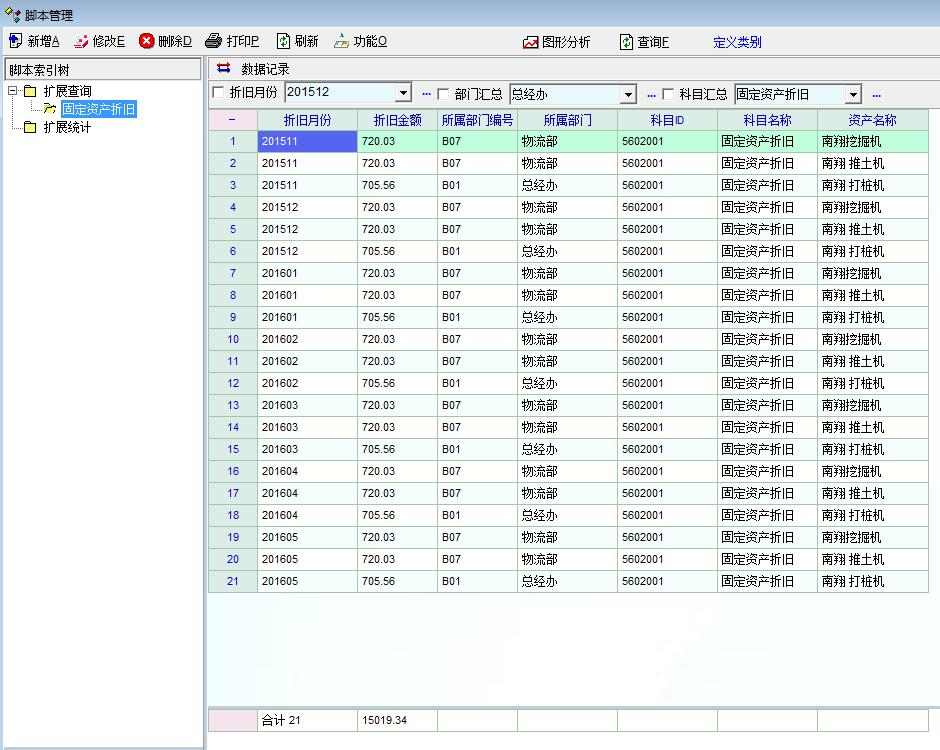 一年多前,分享了一个不成熟的自定义报表: 固定资产折旧明细表 原地址:http://onlyit.cn/topic_list_detail?subject_id=3&page_id=1&topic_id=79932 近期安徽-大志兄说建议加上资产名称栏,经过几番折腾,实现了这个功能,但是这个自定义的固定资产折旧明细表 依然不完美。聊胜于无吧,各位有什么更好的方法、意见、建议请多多指教、交流。 下次更新会实现按资产名称汇总,本人懒惰,请勿催促,更莫等待。 还是分两部分: 第一部分是在配制管理->数据脚本里面建立一个扩展查询: 查询脚本如下: int func_can_run() { return 1; }; int func_def_lmt() { dt_define('cycle','select cycle_id,cycle_id from asset_cycle'); def_lmt_dict('lmt_dict_id','折旧月份','cycle'); dt_define('dept','select max(a.dept_id) as deptid,b.dept_name from asset_dept_apart a left join app_dept b on a.dept_id = b.dept_id group by dept_name'); def_lmt_dict('lmt_dept_yesno','部门汇总','dept'); dt_define('subid','select max(a.subject_id) as subid,b.name from asset_dept_apart a left join evm_subject b on a.subject_id = b.subject_id group by name'); def_lmt_dict('lmt_subid_yesno','科目汇总','subid'); def_lmt_set_val('lmt_yes_no',"yes"); return 1; }; int func_init_lmt_val() { return 1; }; int func_def_field() { db_set_field_count(7); db_set_field_info(0,'dict_id',"折旧月份",100); db_set_field_info(1,'code',"折旧金额",80); db_set_field_info(2,'dept_id',"所属部门编号",80); db_set_field_info(3,'name',"所属部门",100); db_set_field_info(4,'sub_id',"科目ID",100); db_set_field_info(5,'sub_name',"科目名称",100); db_set_field_info(6,'asset_name',"资产名称",300); return 1; }; int func_def_imp() { return 1; }; int func_init() { return 1; }; int func_query() { string sql,sql_bydept,sql_normal,sql3,sql4,sql5,sql6,sql_special,logic; sql_bydept="select a.cycle_id,sum(a.val_depre) as val,c.dept_id,d.dept_name,c.subject_id,e.name,'NULL' "; sql_normal="select a.cycle_id,a.val_depre,c.dept_id,d.dept_name,c.subject_id,e.name,f.asset_name "; sql3="from (((asset_acc a left join asset_dept_apart c on c.asset_id=a.asset_id) "; sql4="left join app_dept d on d.dept_id=c.dept_id) "; sql5="left join evm_subject e on c.subject_id=e.subject_id) "; sql6="left join asset f on a.asset_id = f.asset_id"; logic=lmt_checked("lmt_dict_id") +""+ lmt_checked("lmt_dept_yesno") +""+ lmt_checked("lmt_subid_yesno"); switch(logic) { case "000": sql=sql_normal+sql3+sql4+sql5+sql6; //msg("啥都没被勾选"); break; case "100": sql=sql_normal+sql3+sql4+sql5+sql6+" where a.cycle_id='" + lmt_val("lmt_dict_id") + "'"; //msg("折旧月份被勾选"); break; case "010": sql=sql_bydept+sql3+sql4+sql5+" group by a.cycle_id,c.dept_id,d.dept_name,c.subject_id,e.name"; //msg("部门汇总被勾选"); break; case "001": sql="select a.cycle_id,sum(a.val_depre) as val,'NULL','NULL',c.subject_id,e.name,'NULL' "; sql=sql+"from ((asset_acc a left join asset_dept_apart c on c.asset_id=a.asset_id) "; sql=sql+"left join app_dept d on d.dept_id=c.dept_id) "; sql=sql+"left join evm_subject e on c.subject_id=e.subject_id "; sql=sql+" group by a.cycle_id,c.dept_id,c.subject_id,e.name"; //msg("科目汇总被勾选"); break; case "110": sql=sql_bydept+sql3+sql4+sql5+" where a.cycle_id='" + lmt_val("lmt_dict_id") + "' group by a.cycle_id,c.dept_id,d.dept_name,c.subject_id,e.name"; //msg("折旧月份、部门汇总被勾选"); break; case "011": warn("请检查!部门汇总、科目汇总不能同时被勾选。"); break; case "101": sql="select a.cycle_id,sum(a.val_depre) as val,'NULL','NULL',c.subject_id,e.name,'NULL' "; sql=sql+"from ((asset_acc a left join asset_dept_apart c on c.asset_id=a.asset_id) "; sql=sql+"left join app_dept d on d.dept_id=c.dept_id) "; sql=sql+"left join evm_subject e on c.subject_id=e.subject_id "; sql=sql+" where a.cycle_id='" + lmt_val("lmt_dict_id") + "' group by a.cycle_id,c.dept_id,c.subject_id,e.name"; //msg("折旧月份、科目汇总被勾选"); break; case "111": warn("折旧月份、部门汇总、科目汇总被勾选。"+nl()+"请检查!部门汇总、科目汇总不能同时被勾选。"); break; }; db_run(sql); return 1; }; int func_run_over() { grid_mark_sum("MG","code"); return 1; }; int func_dbl_click() { return 1; }; 第二部分是在固定资产报表里面的功能菜单-》报表分组脚本定义里面添加如下脚本: int init() { rep_add_group("固定资产折旧"); // rep_add_rep("hello","Eba_007","客户报表1"); rep_add_csp_rep("固定资产折旧","ds_001","固定资产折旧报表"); return 1; }; |