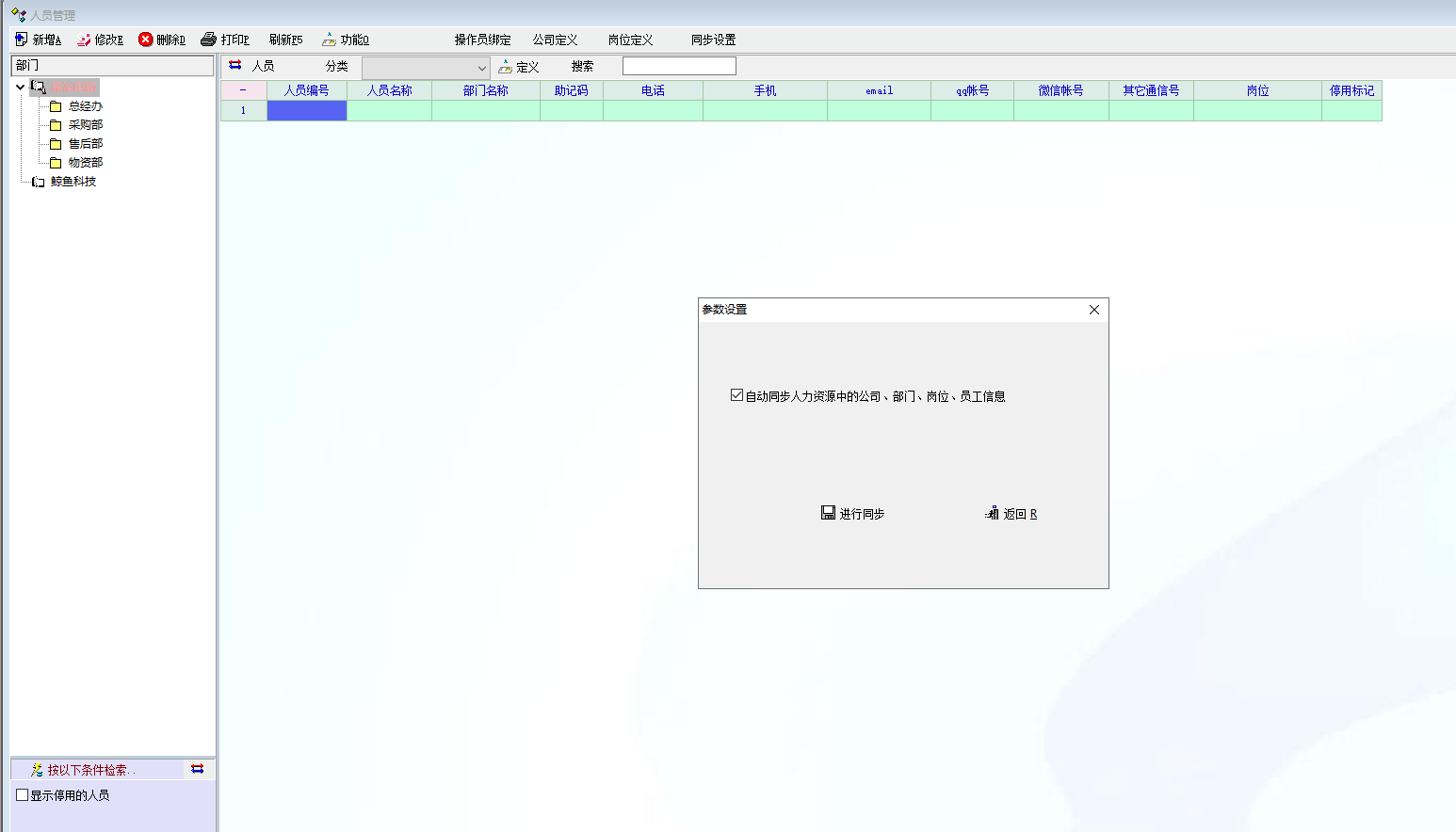 同步的话你得在人事资料里先建立公司部门人员等信息,然后业务部门人员那里自动就会出现。