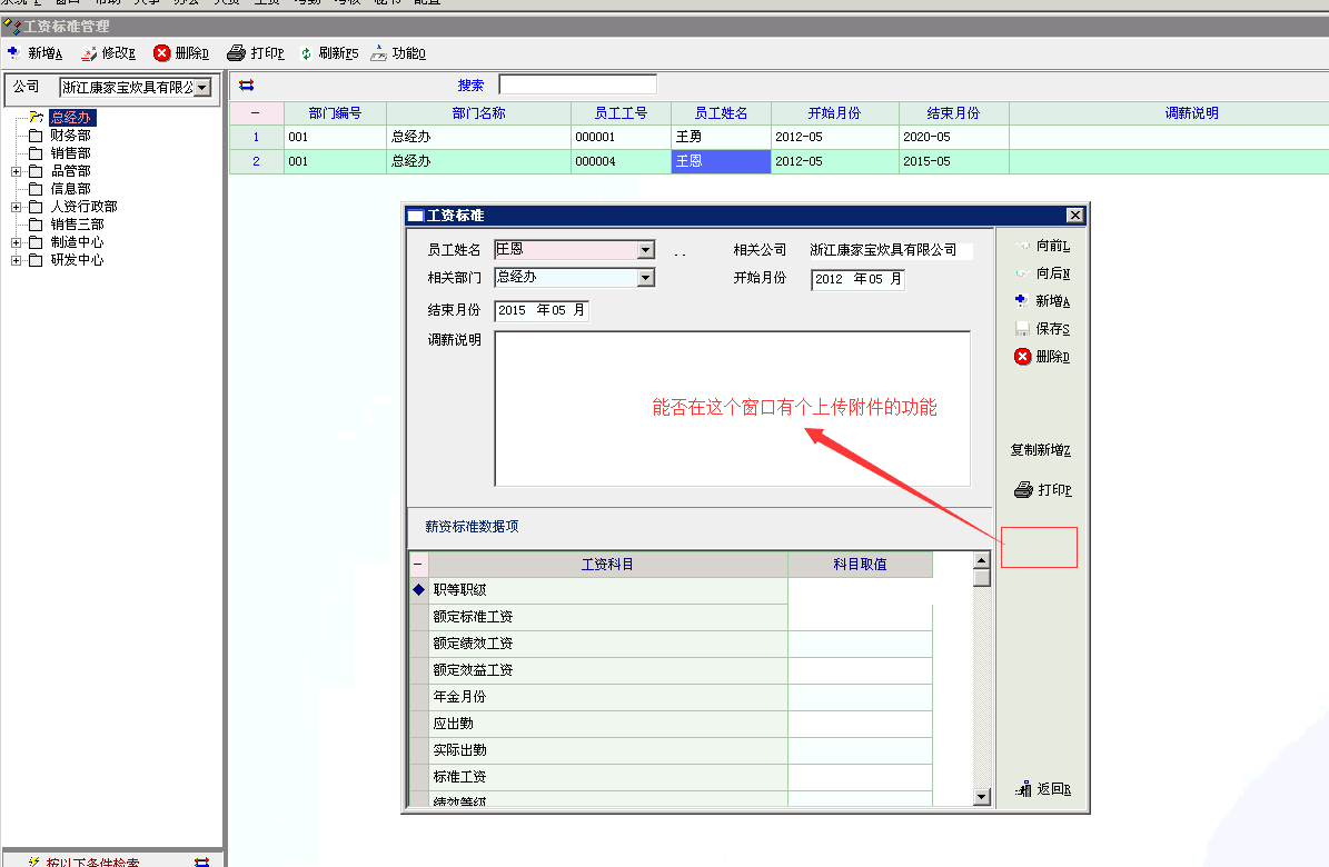 人事模块中的合同选项选择后上传合同附件为必填项,工资标准那需要加上上传附件的功能,请帮帮忙,谢谢!