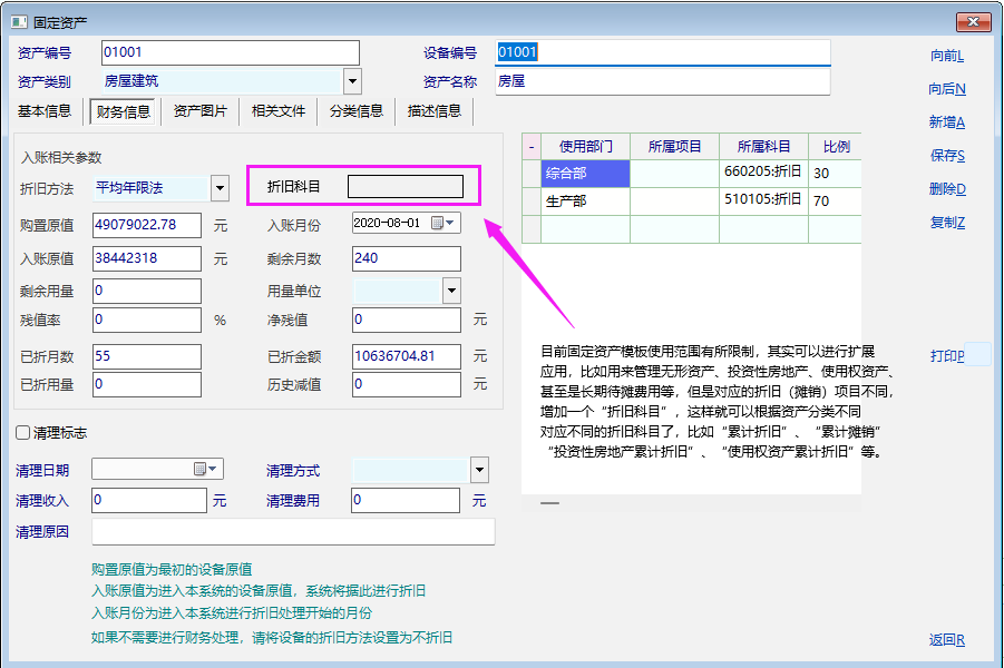 目前固定资产模块的使用场景仅限于固定资产,实务中有许多与固定资产类似的资产,可以用固定资产模块来管理,采用不同的分类即可,但是目前资产卡片里没有“折旧科目”指定,虽然可以根据资产类别分别生成凭证,但终究是不太方便,如果在资产卡片里可以指定折旧科目就方便多了。比如固定资产对应的折旧科目是“累计折旧”,无形资产对应的折旧科目是“累计摊销”,投资性房地产对应的折旧科目是“投资性房地产累计折旧”,使用权资产对应的折旧科目是“使用权资产累计折旧”等等。