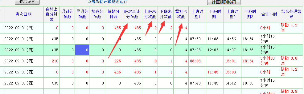 希望在界面上添加当天班次“合计分钟数”“请假记录”“出差记录”“请假记录”“调休记录”“加班记录”“外勤记录”“缺勤记录”这些项目的数据体现,便于有参与这些项目计算的用户设置简单的公式用于计算。还有考勤月帐里面的出勤天数的计算---因为是按打卡就算出勤一天,这种统计方式是不对的。因该按实际出勤时间(除去加班时间)除以当天排班的“班次合计”时间来计算出勤天数,所以最好在考勤日帐里面也需要显示天数的计算((合计分钟数-加班分钟数)/班次合计分钟数)。不然,目前8个扩展项目根本不够使用!希望重点考虑