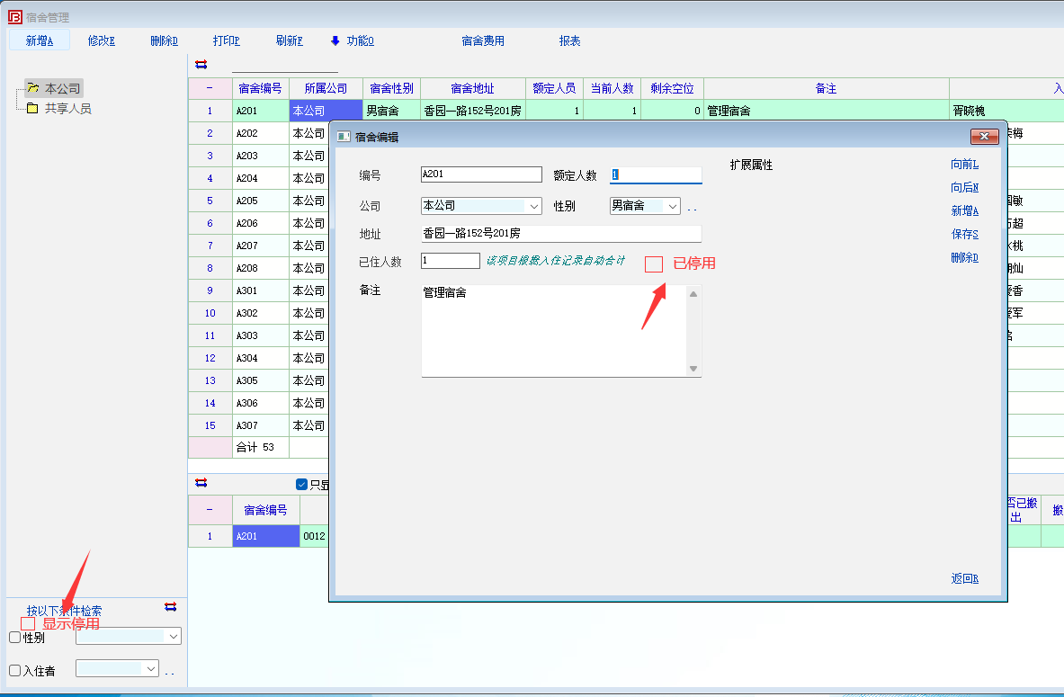 旺季时我们向周边出租房租很多间房做宿舍,记录在系统里,进入淡季后陆续退租,如系统增加一个停用的功能就比较实用,停用默认不显示,也可检索显示停用,下次继续租同一房间去掉停用就可以啦。