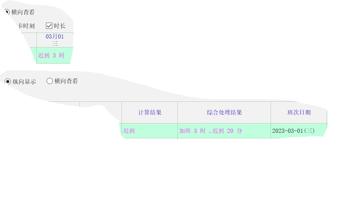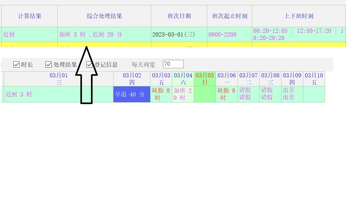 同样是3月1号的考勤,纵向显示是加班3小时,迟到20分,但是横向查看却显示迟到3个小时。 显示内容不一致。