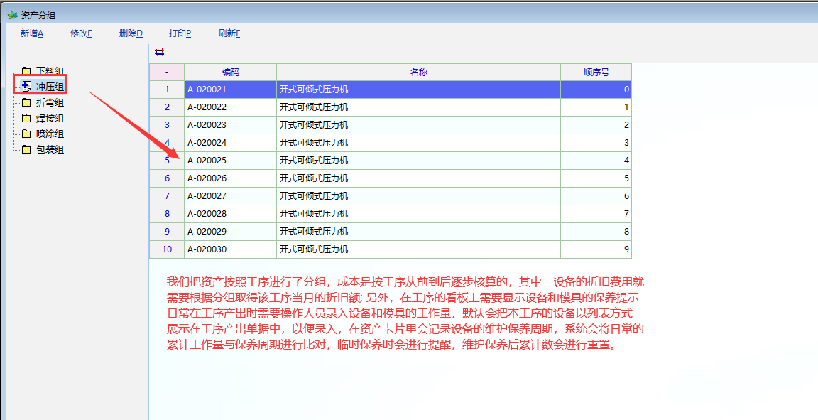 主要应用于成本核算,资产按工序分组,每月取分组的折旧等信息。另外,进行设备维保提醒时和日常使用量统计时也会将本工序默认的设备列表显示出来(工序旁边放有柜机和看板)。