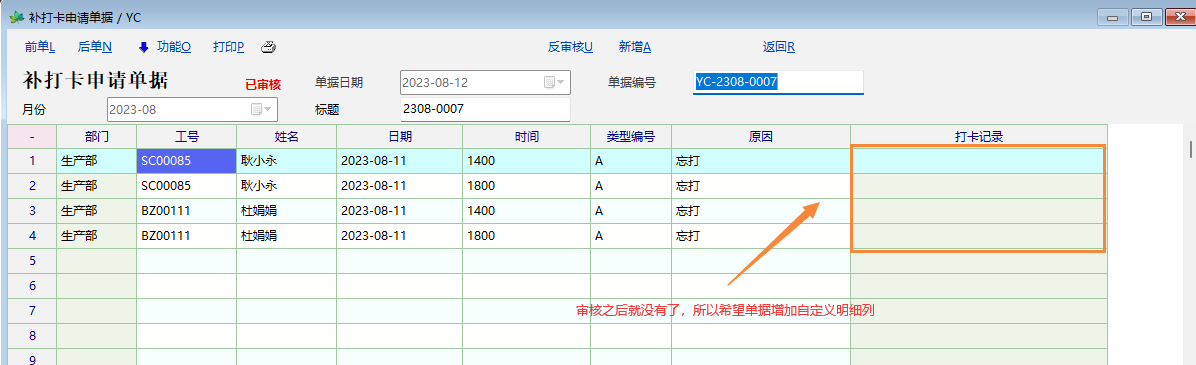 补卡申请单没有其他单据默认的自定义明细,也不支持明细扩展,希望能否像其他单据一样,增加自定义明细。
