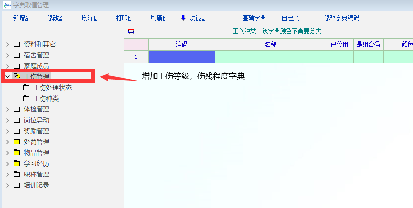 2:在工伤管理字典中增加工伤等级,伤残程度数据字典