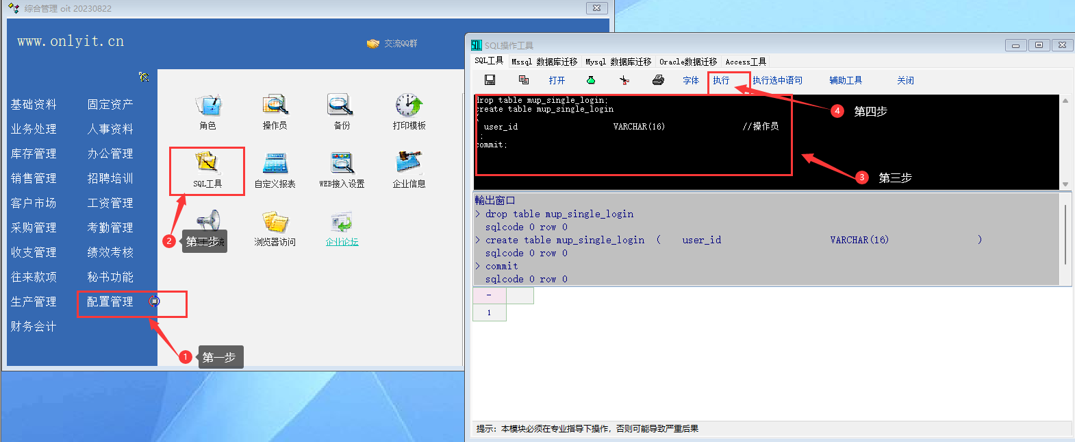 进入系统后到配置管理执行sql工具,复制下面的sql语句进去后点击执行,然后重新进入系统。