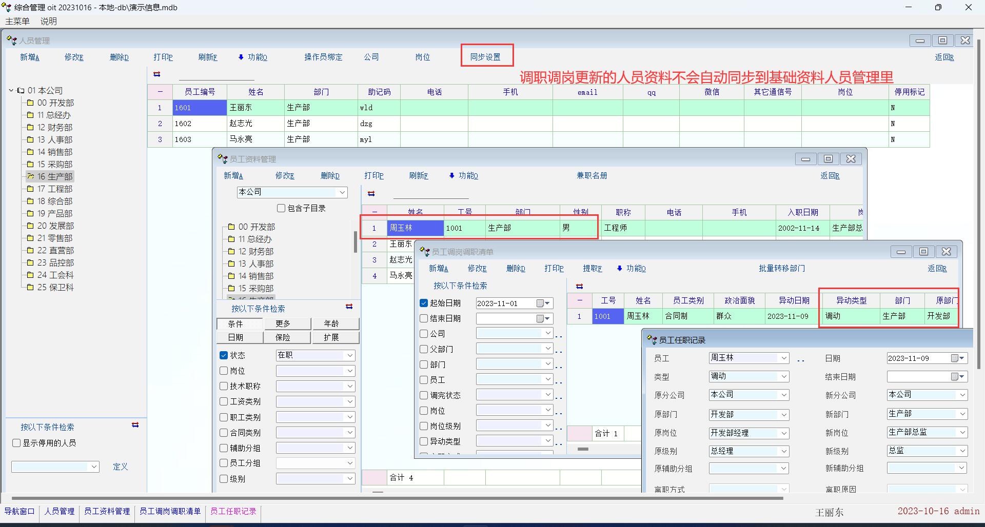 如果是人员资料里直接修改就自动同步,调职调岗编辑记录就不同步,要基础资料--部门人员同步设置里点一下“进行同步”,才会同步,有些不方便;