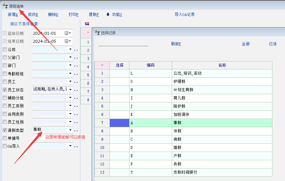 原创_请假记录里面--考勤报表里面的请假清单里面----请假类型希望支持可以多选_人力资产