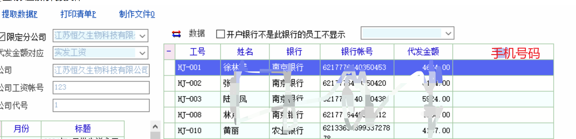 工资生成代发文件界面新增银开户银行和手机号,现在银行代付需要提供员工手机号。