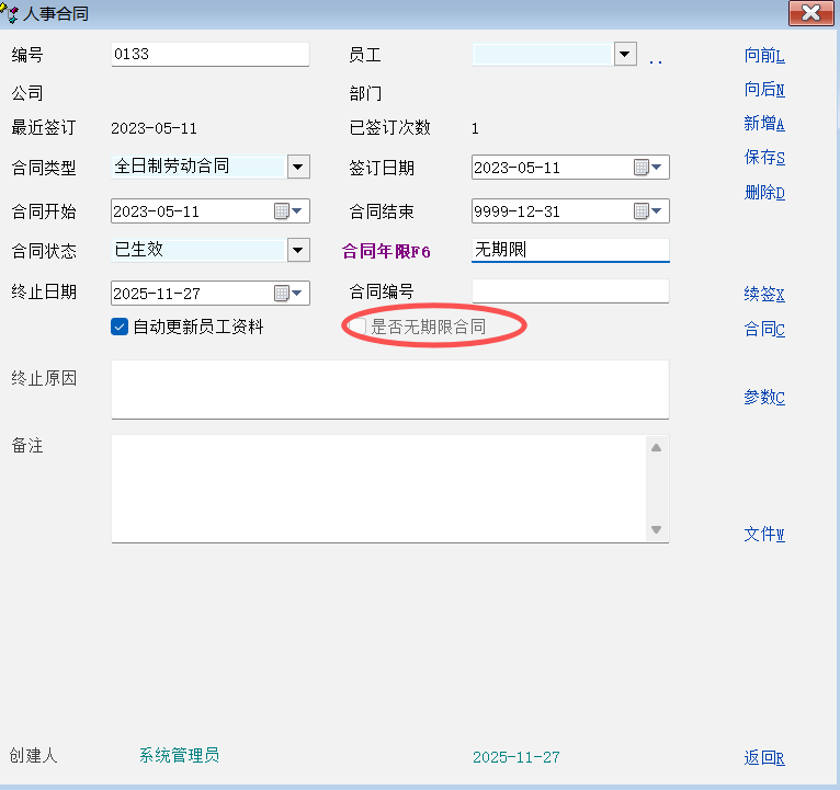 3:合同是否无期限是在合同类型定义里设置的,不是在这里勾选的