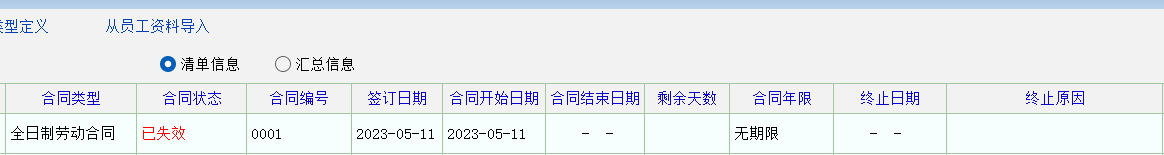 1:你这之所以会失效是你的终止日期到了,无期限合同是没有固定的合同结束日期及终止日期的,或得说合同结束日期及终止日期应该是员工的法定退休年龄的,而在软件上无期限的合同结束日期及终止日期的年限应该是2999-01-01才对,你这等于是虽然合同结束日期无限大,但你又提前终止的合同了