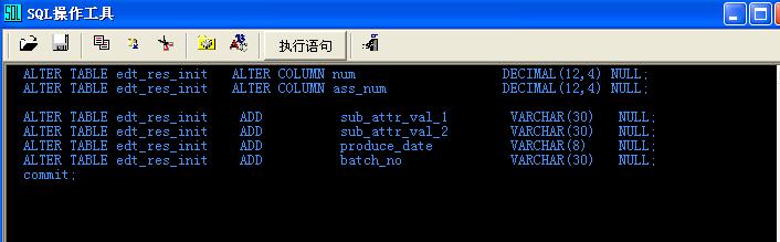 你用1230的版本打开正式库,然后在sql工具里面执行下面的语句(把下面的语句复制到 sql执行工具里面,然后点执行), 然后再用升级包升级。 ALTER TABLE edt_res_init ALTER COLUMN num DECIMAL(12,4) NULL; ALTER TABLE edt_res_init ALTER COLUMN ass_num DECIMAL(12,4) NULL; ALTER TABLE edt_res_init ADD sub_attr_val_1 VARCHAR(30) NULL; ALTER TABLE edt_res_init ADD sub_attr_val_2 VARCHAR(30) NULL; ALTER TABLE edt_res_init ADD produce_date VARCHAR(8) NULL; ALTER TABLE edt_res_init ADD batch_no VARCHAR(30) NULL; commit; |