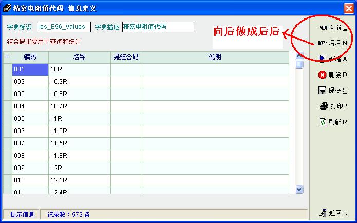 由于我是做电子制造行业的,前期的编码分类工作相当复杂,单就电子元件里的电阻,按规格、封装、功率、误差值等来说就有几十种,但每种电阻的阻值都是按E24和E96标准来定的,如:功率1W的插件电阻按E96标准就有570个阻值,同样1/2W、1/4W、1/8W……甚至贴片电阻的0603、0805、1206……等封装都有相同的各570个阻值,因此在字典里预先编好阻值代码是很重要的。