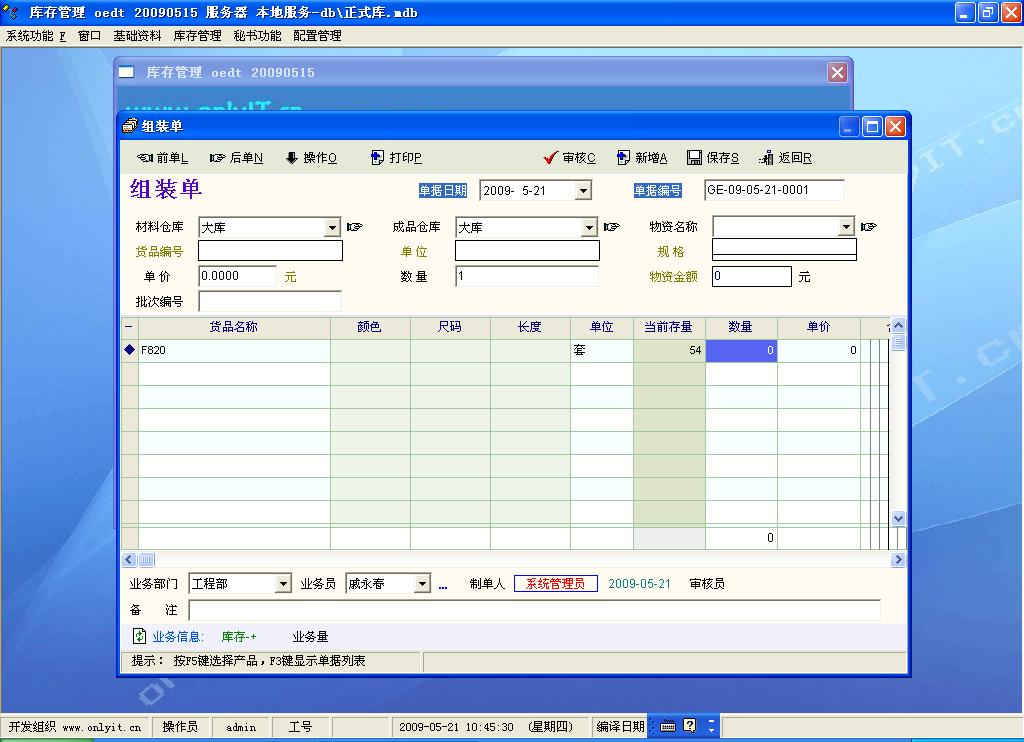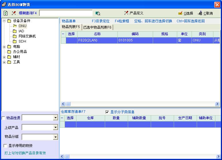 点了新增单据,还是一样,在组装单的物资名称下拉列表中没有可选物品,点击右侧手型图标进入“选择BOM物资”窗口有此物品,但选择以后不在组装单的物资名称选择框中显示。