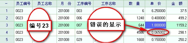 问题是工价是在工序定额中拟定好的,按照你的计算方式做同一道工序显示出来的工价就不一样了,虽然工资相差不多,但打印报表看起来却不爽了。编程时应该是工价乘以数量,而不是以工资除出数量,没有工价哪来工资,所以说还是工价显示有问题。(上面的图片是同一道工序,定价为0.065,只是不同编号的员工操作,显示出来的工价却不相同)