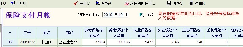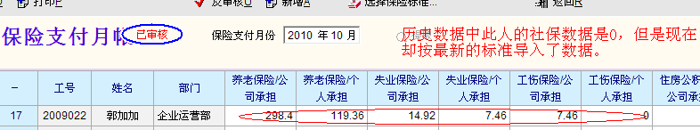 2、但是在历史数据上,如本月是11月,那么11月以前的数据都会按11月的社保标准进行数据修正。而且自己手动修改后的数据保存后,在审核的时候会重新按社保标准进行计算,以10月数据为例的贴图如下:
