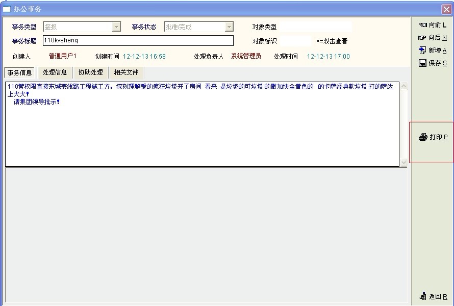 上图,是在管理员进入办公事务卡片才有的 打印 按钮。 普通操作员 则没有!