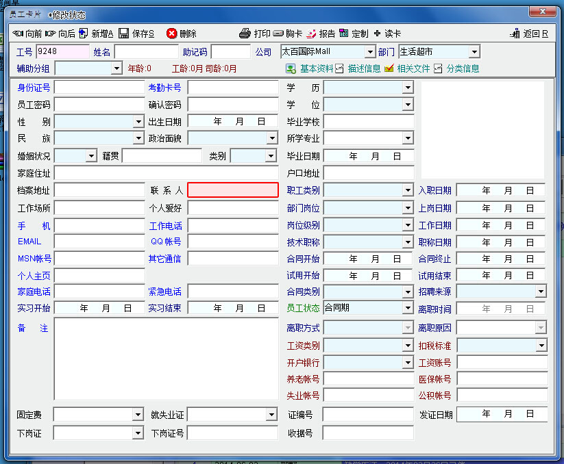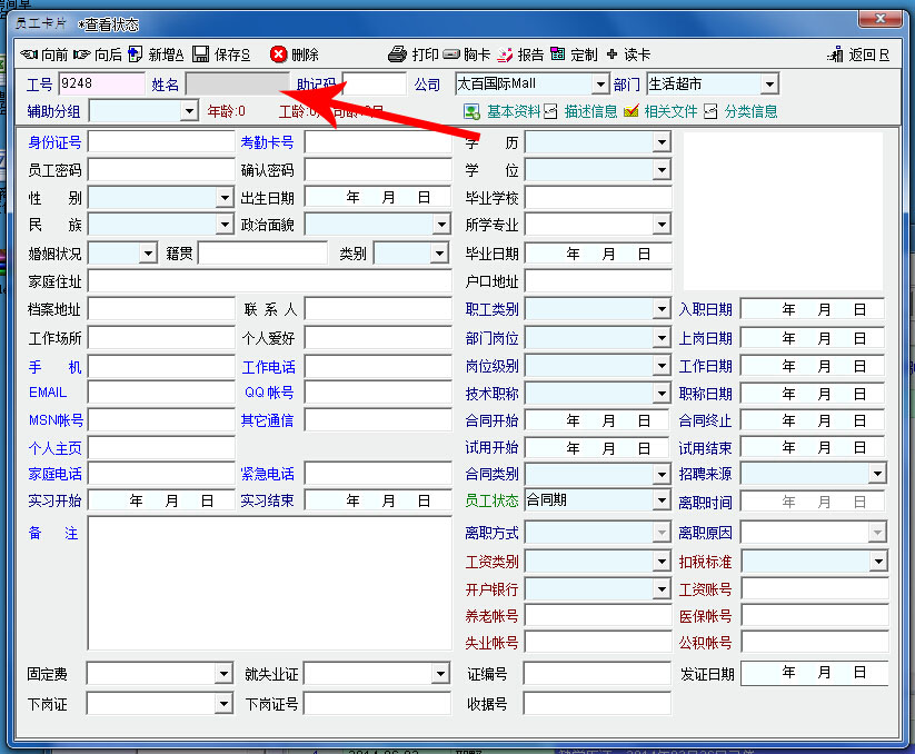 1、从“员工管理”内进入“员工卡片”页面,建议双击后直接进去是“查看状态”在窗口标题栏用“星号*”提示(见图一窗口标题栏)。所有文本窗格为灰色不可编辑状态。
