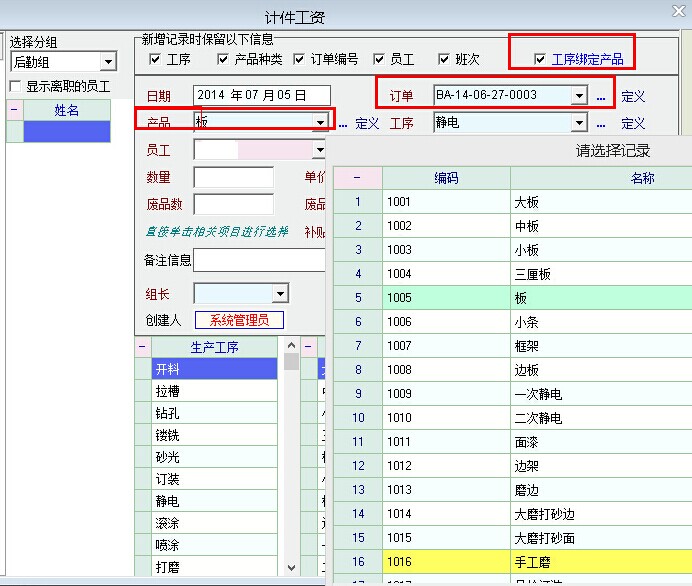 【产品】--改为【部件】比较合理;再增加一个【产品】名称,引用【生产订单】和【销售订单】里的产品,如果选择了【工序绑字产品】,则【部件】里,则显示相应的这个产品的bom 半成品