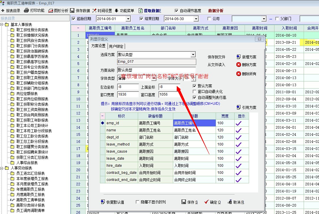 请老师在“员工离职清单”内加上“岗位名称”和“手机号”方便查询,谢谢!