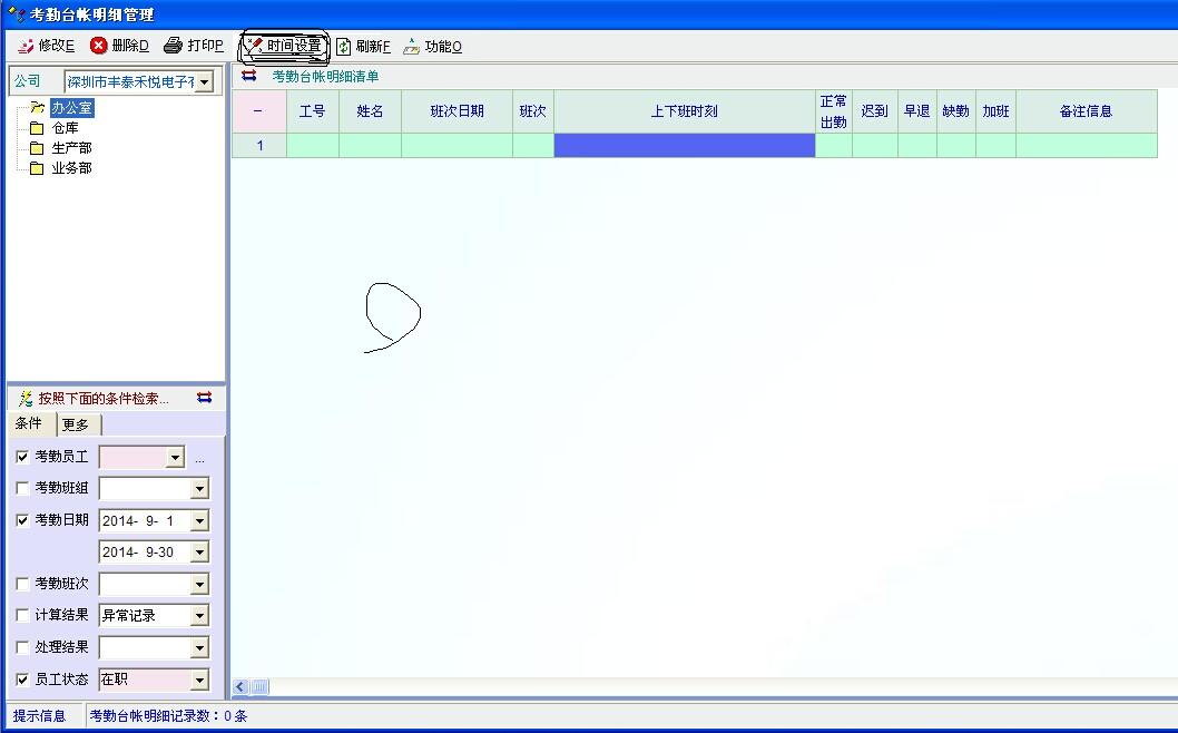 考勤台账没有 “时间设置” 按扭,建议添加,效果如下图