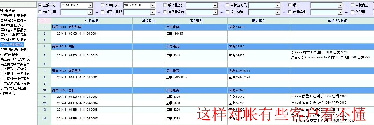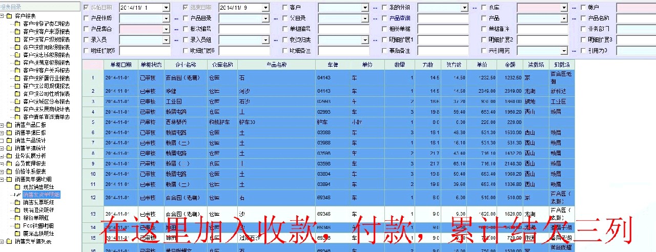 老师,可以在销售报表--销售类单据明细中加入收款,付款,结欠款三列吗?因为这样方便对帐,像软件中原来在往来款项中对帐,有些人看并不懂!