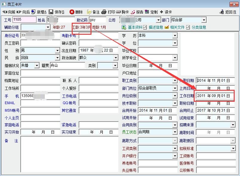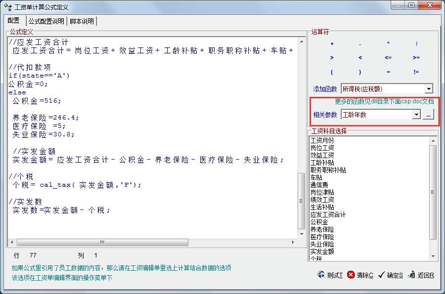 在“员工资料”中,对于工龄的定义是从“工作日期”到现在的时间长度(员工资料中也有显示),但是在“工资单定义公式”中,“相关参数”中的“工龄”年数却指的是“员工资料”中的“司龄”(经调试验证)。