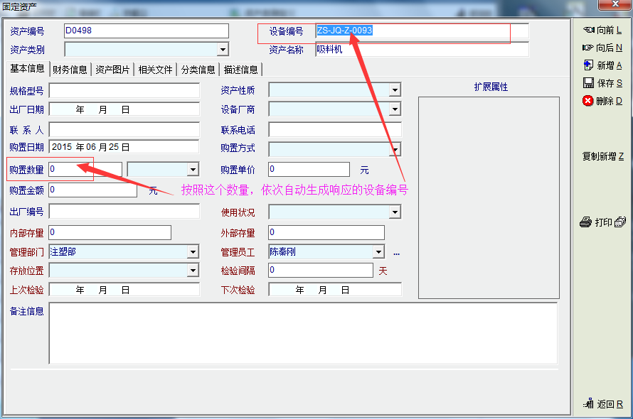 既然是固定资产,那么难免有时候就会采购同样的设备多套,或者是相同种类的设备多套,现在的方式是在采购数量中填入多套,生成也还只是一个设备编号,这样就需要手动重复的输入相同数据多次,比较麻烦。