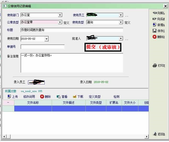 2、  也可以按“秘书功能 办公事务”设计,加上“提交”,提交后数据不能删除也可以。如图所示