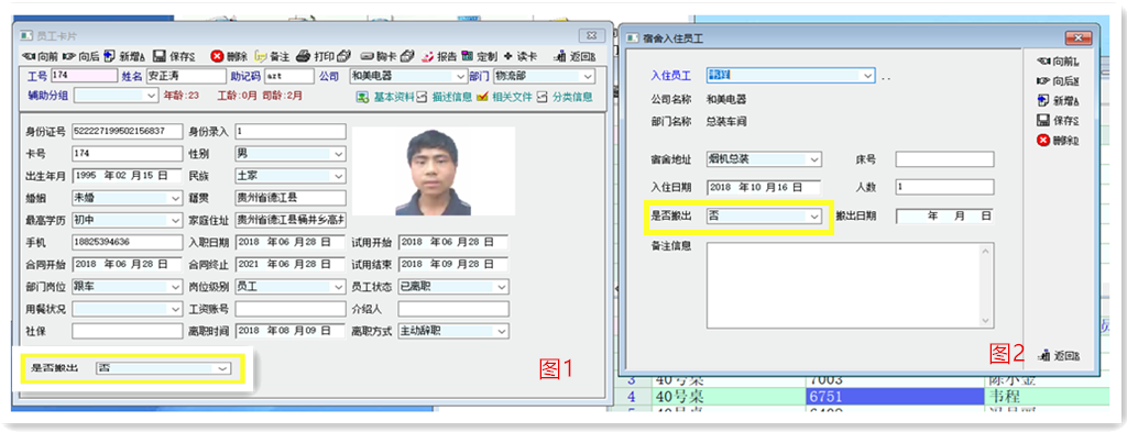 将图2中“宿舍入住员工”中的“是否搬出”选项可以在图1员工卡片中新增这个选项功能。有了这个功能真心会节省很多时间。