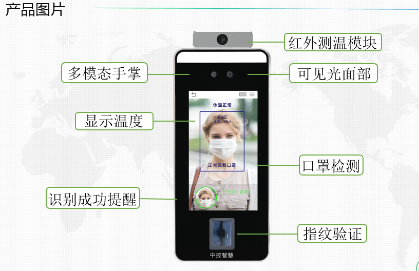 针对目前疫情情况,企业复工测温检查口罩监测困难等情况,特推出一款门禁考勤机: