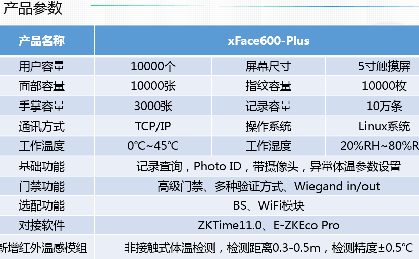 xFace600-Plus是中控智慧根据新冠疫情迫切需求,全新推出的非接触式混合生物识别终端。集可见光面部、多模态手掌等生物识别方式于一体,实现非接触式识别验证,防止交叉感染。新增体温监测模块,自助测温,实时预警,有效监测体温变化。系统匹配体温异常参数设置功能,验证时显示体温异常信息,输出报警信号,及时采取有效措施,适用于社区、校园、医院、景区、酒店、商场、写字楼、公共服务场所等需要进行监测体温的应用场景。