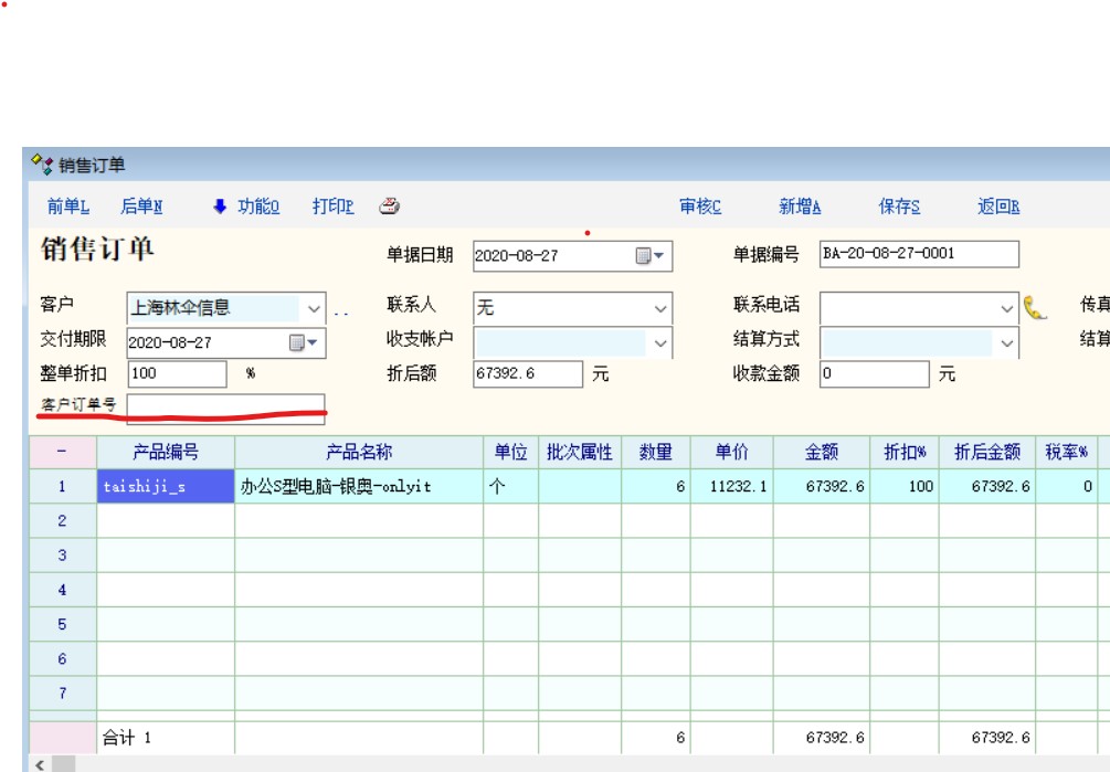 在销售订单中,通过单据对象属性增加一个“客户订单号”;