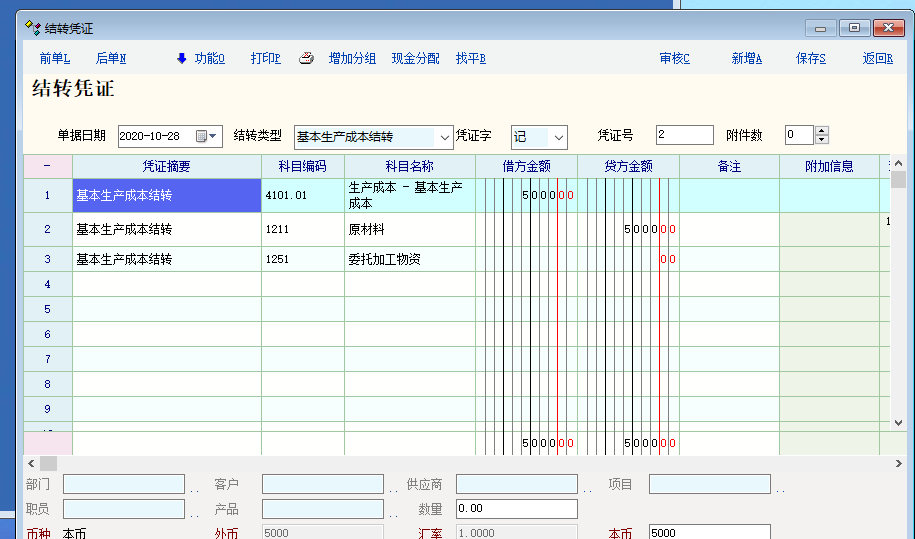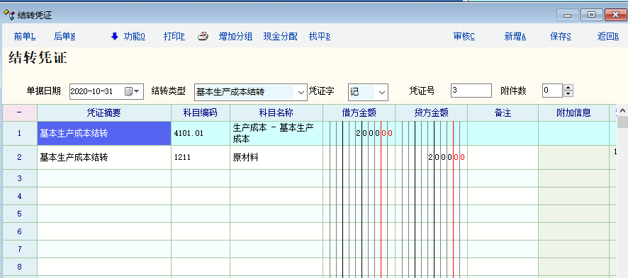 系统在结转定义管理里,缺省定义了“基本生产成本结转”,转出科目为“原材料”,转入科目为“基本生产成本”。