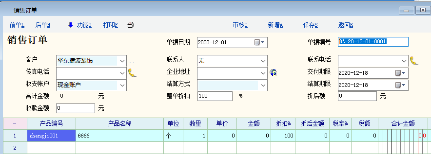 1、创建单据,设定单据日期为2020-12-01,保存。