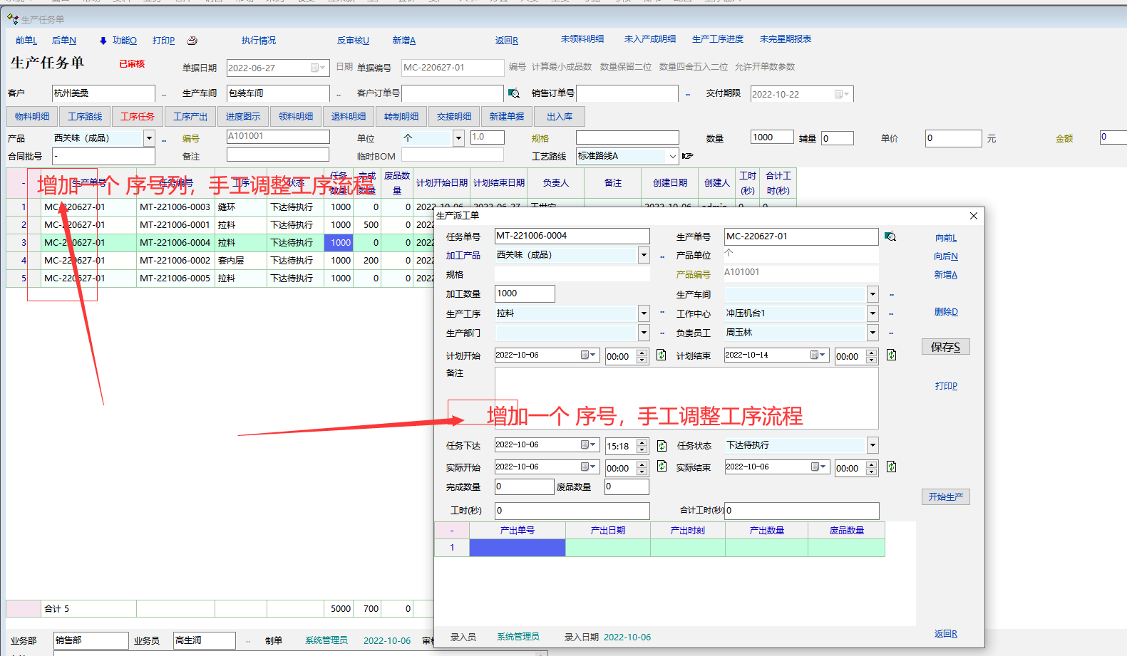 生产任务单 下工序任务单时 工序按序号流程流转,如果想临时修改流程 直接修改序号就可以了。现在好像无法修改临时流程。